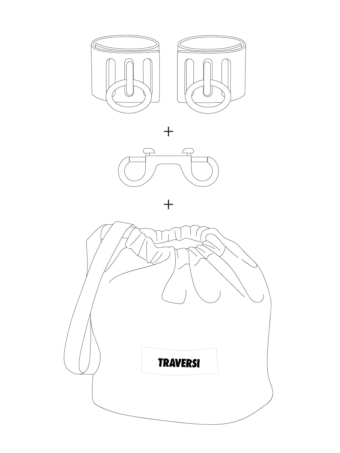 Choose between the Single Set or the Couple Set, which includes both bracelets, two circular carabiners, the connecting double carabiner, and the signature Traversi Pouch Bag.