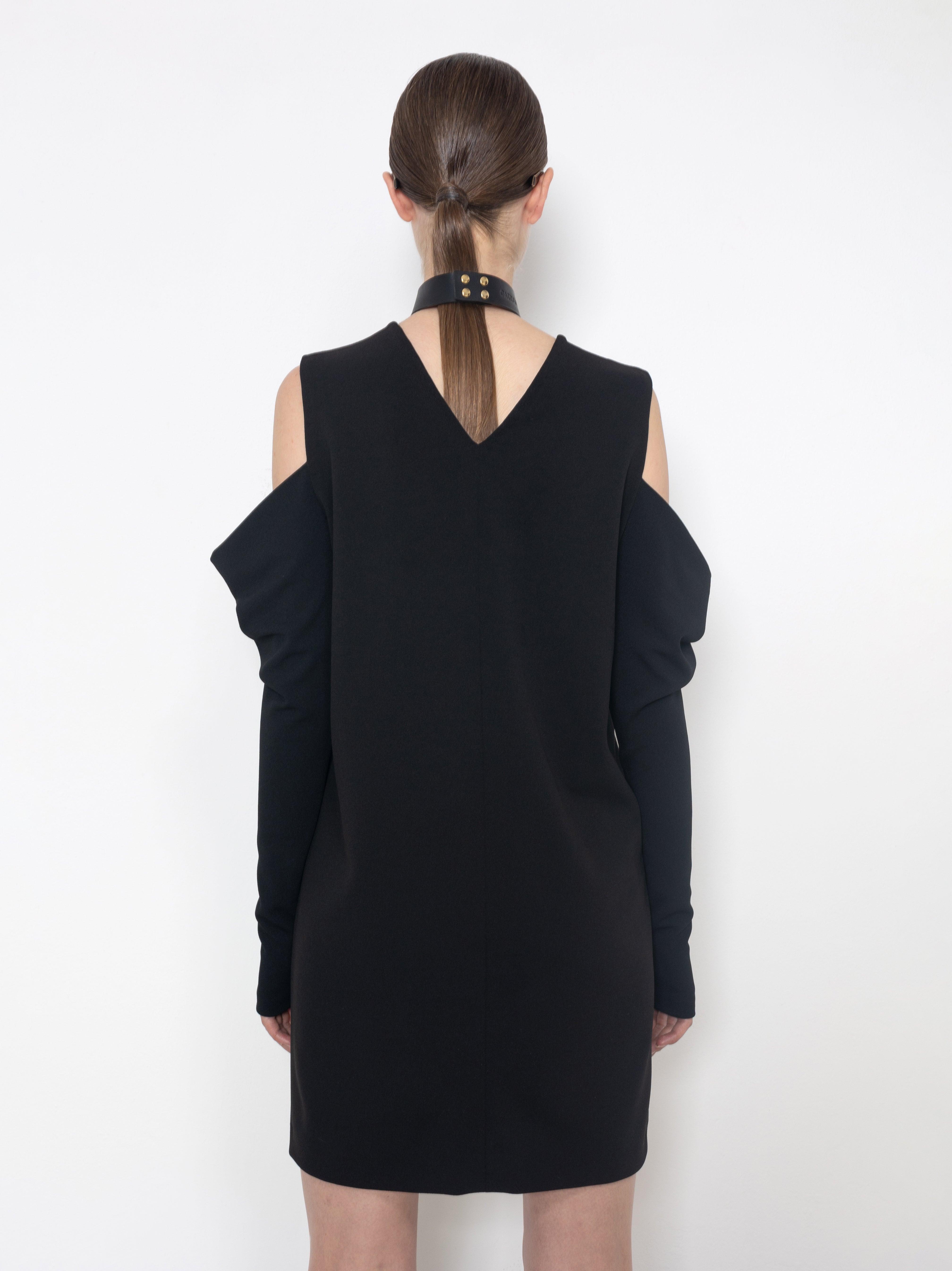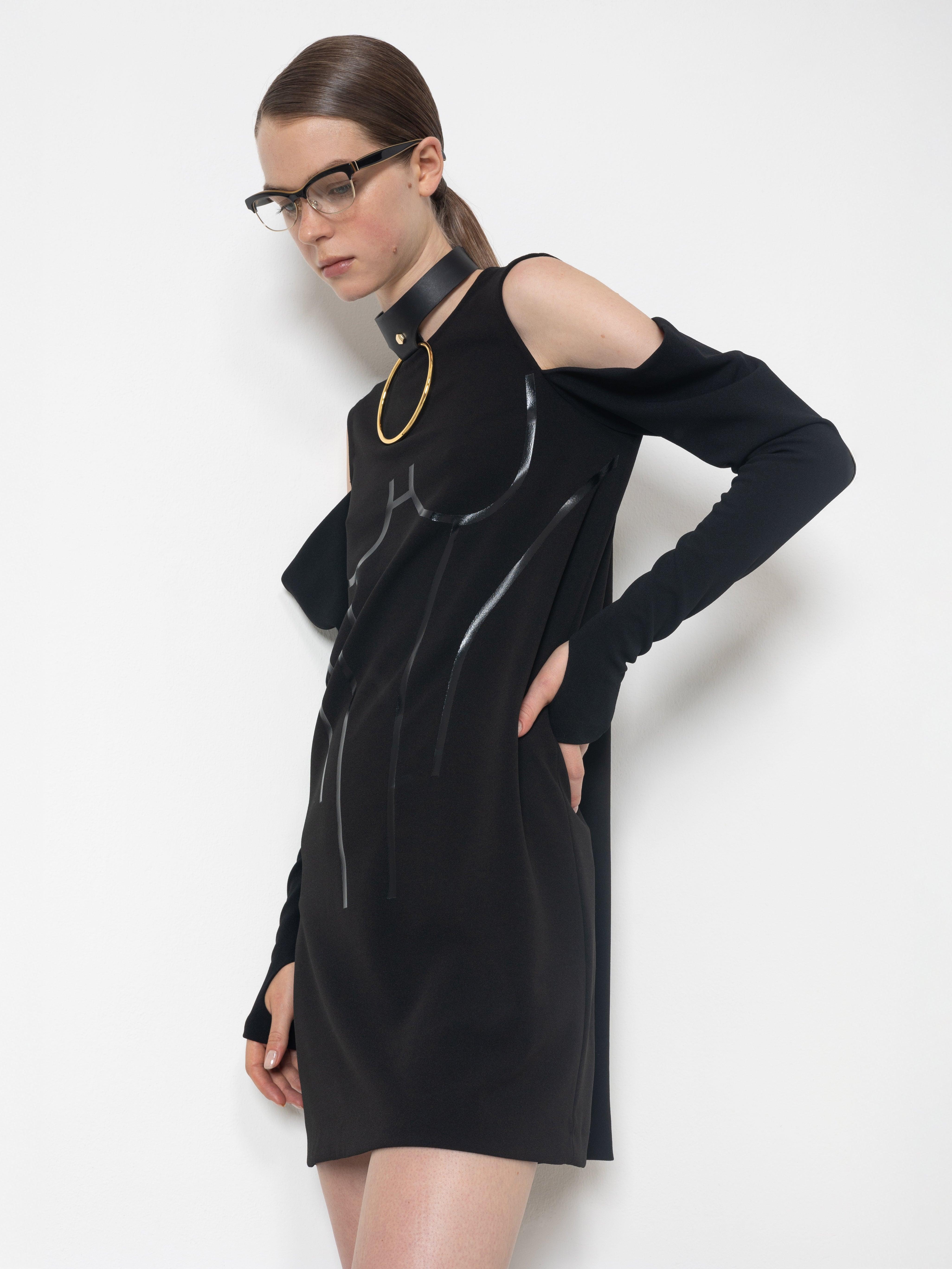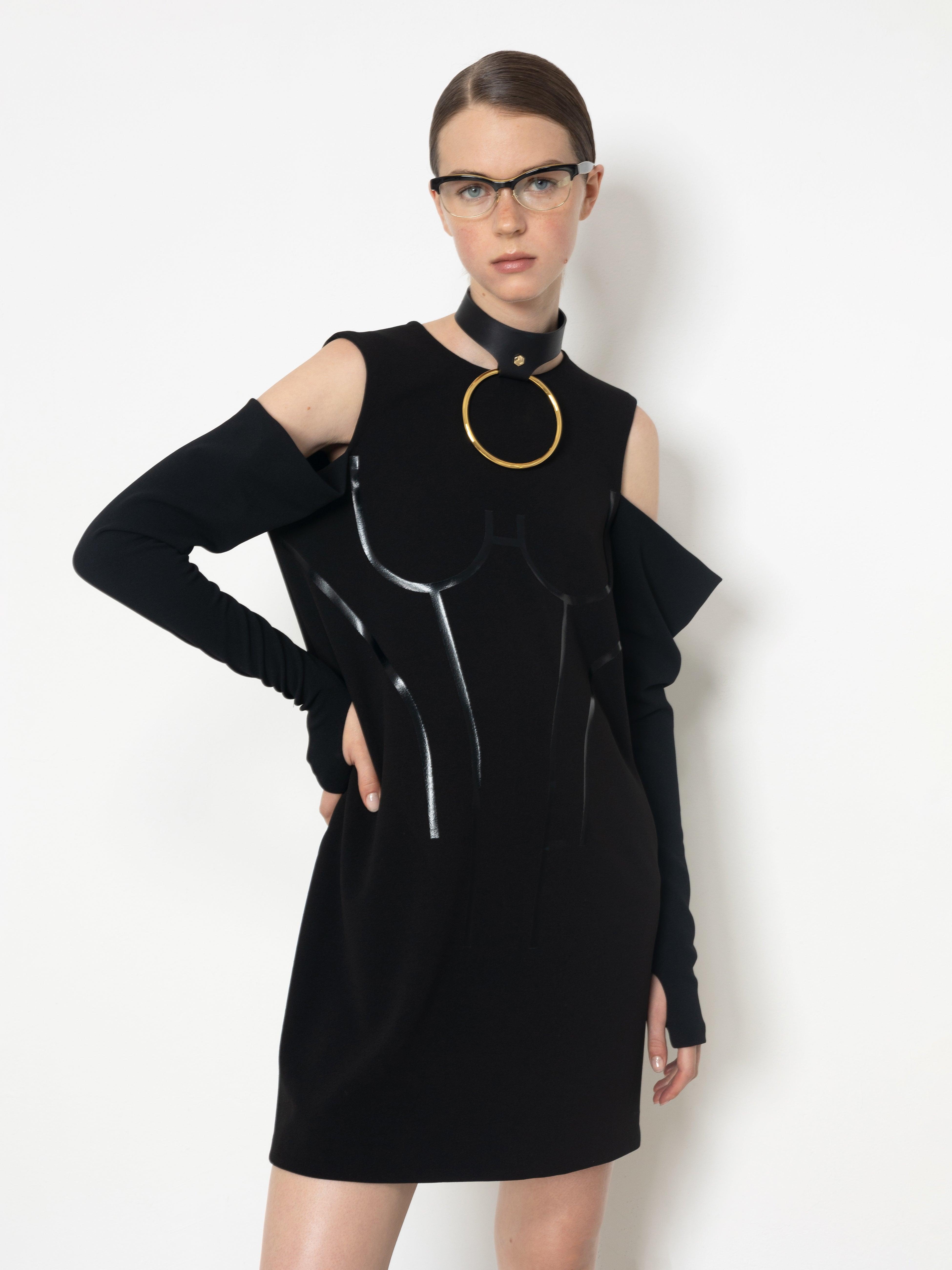 The Glove Corset Mini Dress, crafted from soft black Scuba Crepe, is enhanced by a tone-on-tone vinyl corset print. The cut-out sleeves open with a wide drape and taper into an elegant glove-like design.